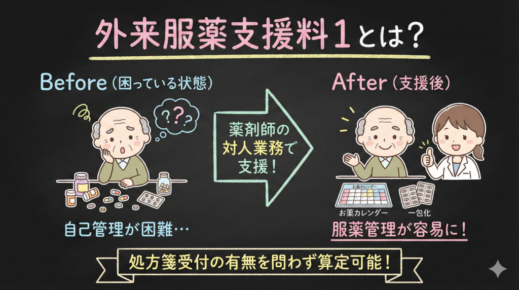 外来服薬支援料1は単なる「一包化」ではなく、患者さんの服薬管理を支援する「対人業務」として評価されています。処方箋受付の有無を問わず算定可能であることが大きな特徴です!