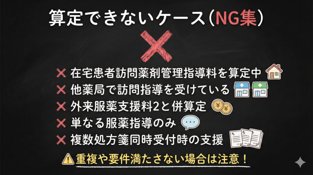 特に、在宅患者への服薬支援は在宅患者訪問薬剤管理指導料に含まれるので、外来服薬支援料1は算定できません。他薬局で訪問薬剤管理指導を受けている患者さんも算定できないのでご注意を!