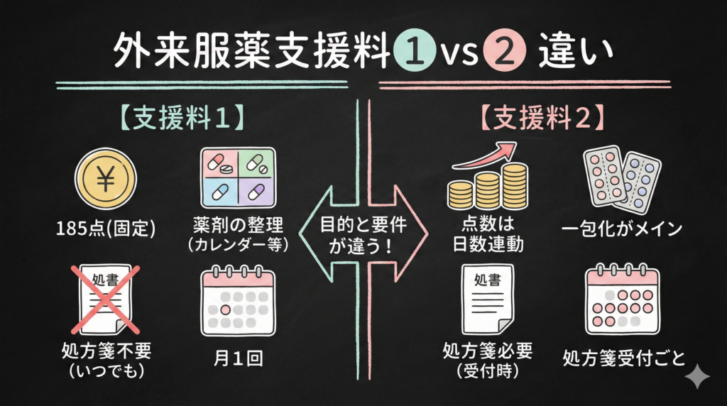 | 処方箋受付 | 不要(処方箋なしでも算定可) | 必要(処方箋受付時のみ算定可) |