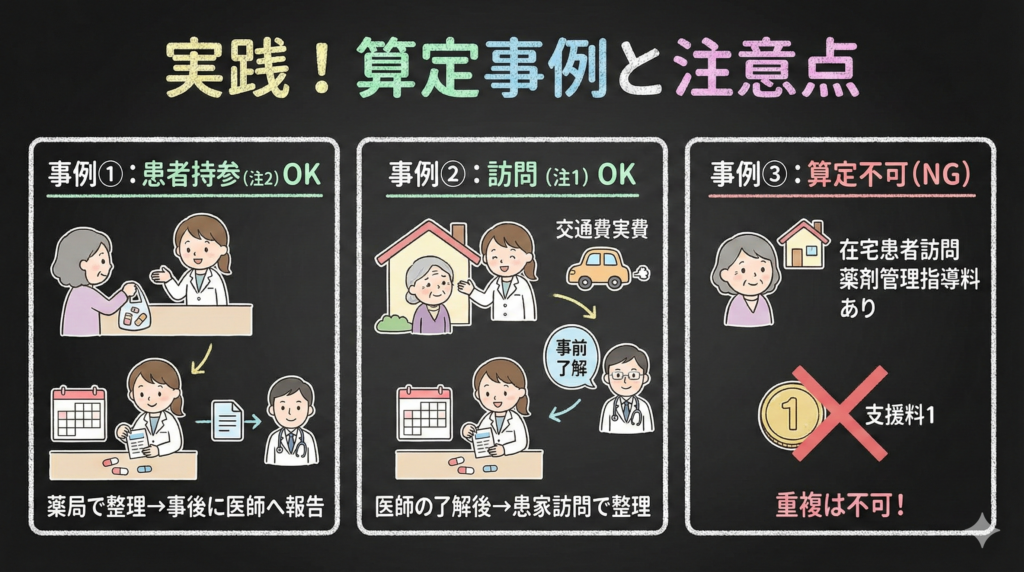 「注1」は事前に処方医の了解を得てから服薬支援を行うケース、「注2」は患者さんが薬を持参し、服薬支援を行った後で処方医に情報提供するケースです。薬剤師が患家を訪問して行う場合は「注1」、患者さんが薬局に薬を持参して行う場合は「注2」が一般的です。
