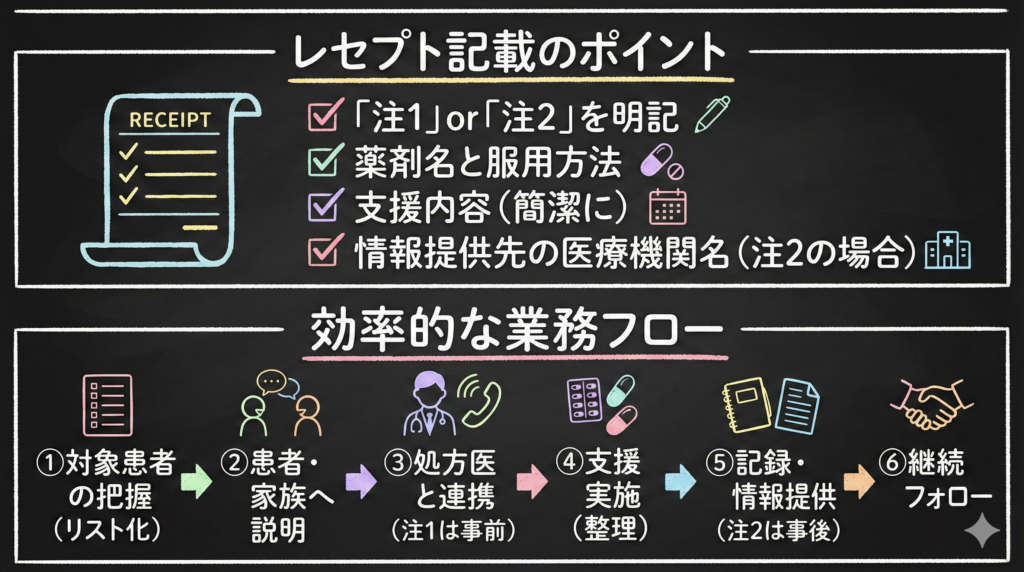 - 記録の徹底: 支援の必要性と実施内容、処方医とのやり取りを記録