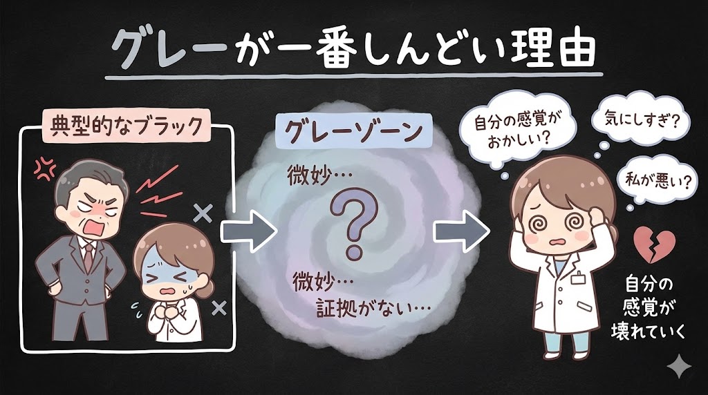 なぜかというと、グレーゾーンでは「自分の感じ方がおかしいのかもしれない」という疑いが生まれるから。殴られたわけじゃない。暴言も録音できていない。でも、特定の上司の前だけ胃が痛くなる。シフト表を見るたびに動悸がする。そんな状態、心当たりありませんか?