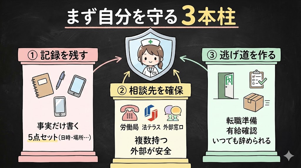 まず自分を守る——記録・相談先・逃げ道の3本柱