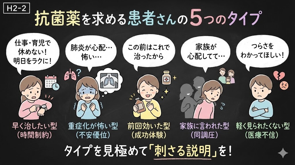 「抗菌薬がほしい」の背景は一様ではありません。ここを見誤ると、こちらの説明が空振りします。どうですか? 以下のタイプ、窓口で見覚えがあるのではないでしょうか。