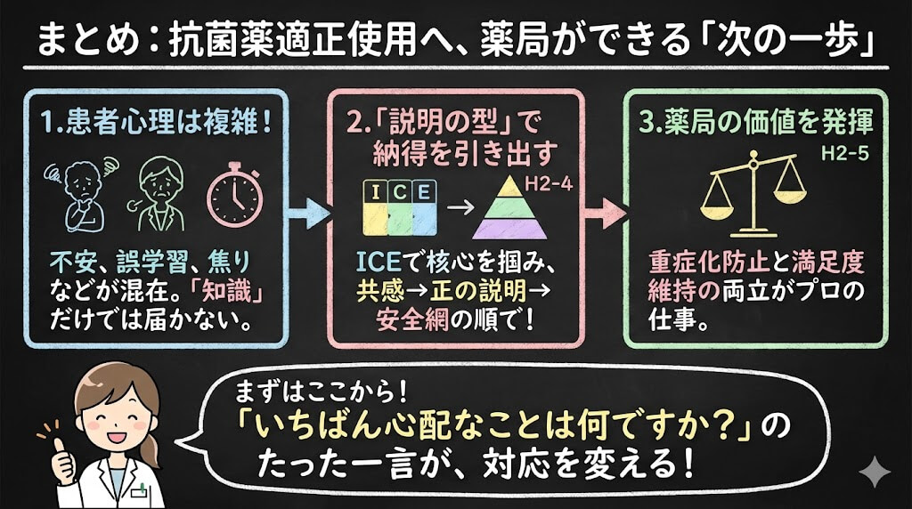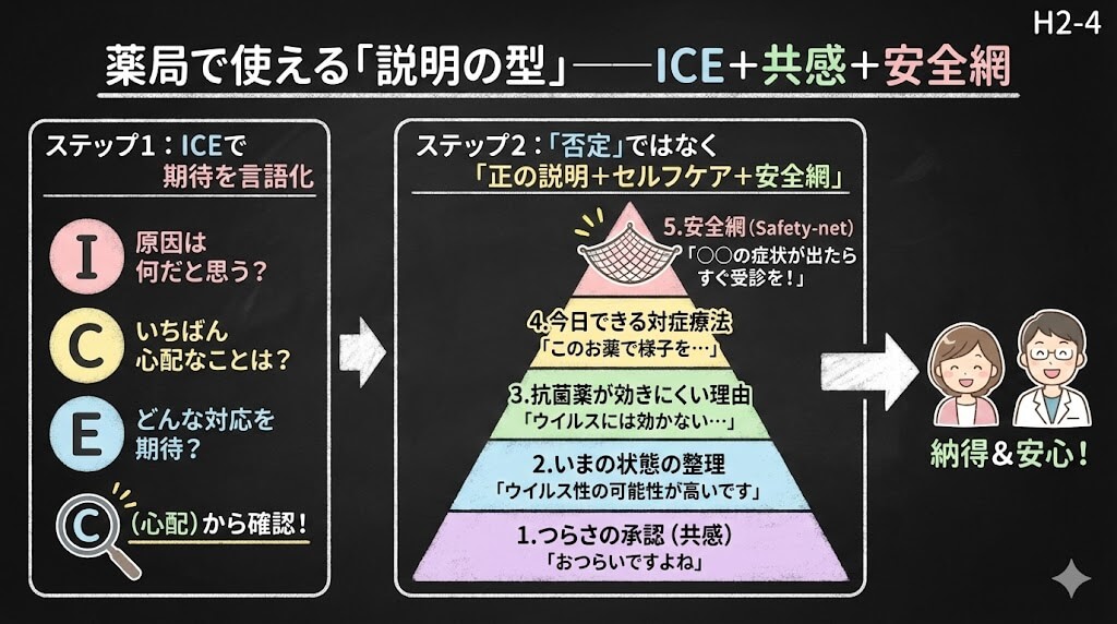 「抗菌薬がほしい」は、情報ニーズと感情ニーズが混ざった訴えです。情報だけ渡しても感情が残り、共感だけしても不安は消えません。両方を扱うことが、薬局ならではの価値になります。