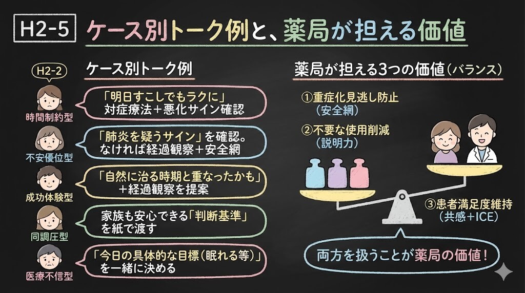 | 早く治したい型(時間制約) | 仕事・育児で休めない焦り | 「明日をラクにする」対症療法+悪化サインの共有 |