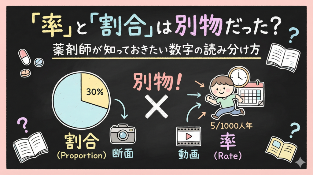この記事では、率と割合の違いを「時間軸」というシンプルな切り口で整理します。難しい数式は使いません。読み終わるころには、論文の数字や添付文書の副作用頻度を、少しだけ正確に読めるようになっているはずです。