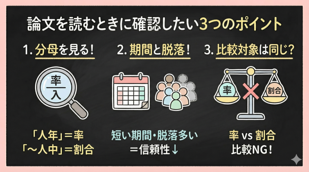 論文のMethodsやResultsで、アウトカムの定義を確認する癖をつけると、数字の意味を誤解しにくくなります。