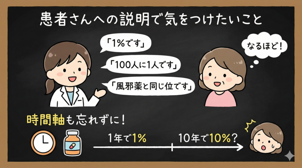 特に長期服用が前提の薬では、累積リスクの概念を伝える必要があります。「1年で1%なら、10年続けたら10%近くになる可能性もある」——この感覚を持っておくことが、患者さんとの信頼関係につながります。