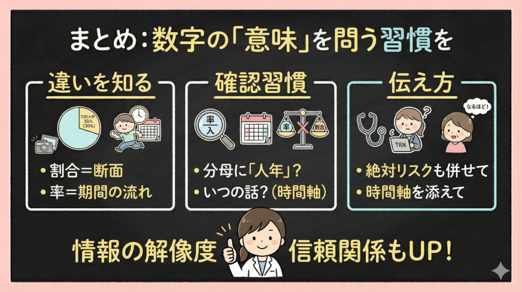 完璧に使い分ける必要はありません。ただ、「この数字、率と割合どっち?」と問いかける習慣があるだけで、情報の受け取り方が変わってきます。