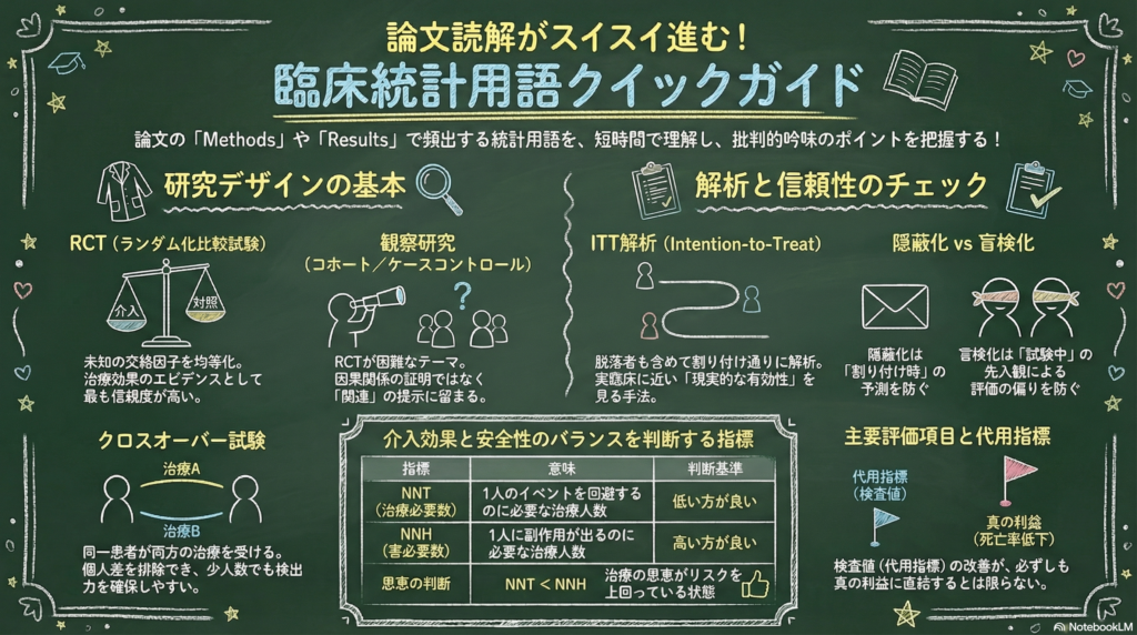 この記事では、研究デザインと解析に関する重要な用語を、薬剤師が実務で使える形で整理します。研究デザインを理解することで、論文の質を判断する力が身につきます。