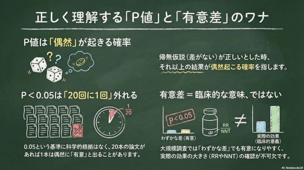 この記事では、p値と有意差の正しい理解、そして臨床的に意味のある効果を見極めるための考え方を整理します。