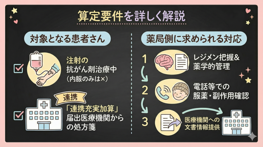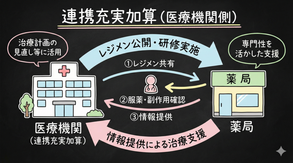 連携充実加算は、外来化学療法を実施する医療機関が地域の薬局と連携して患者支援を行うことを評価する加算です。外来腫瘍化学療法診療料を算定する医療機関が対象となります。