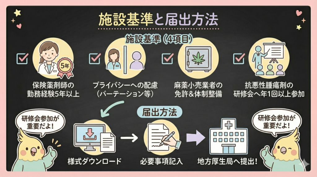 - 麻薬及び向精神薬取締法第3条の規定による麻薬小売業者の免許を取得し、必要な指導を行うことができる体制が整備されていること