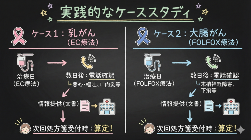 副作用確認のタイミングは、レジメンや副作用の発現時期に合わせて調整するとよいでしょう。例えば、悪心・嘔吐は治療直後から数日間、口内炎は治療後1週間前後、末梢神経障害は治療の積み重ねで徐々に発現するなど、特徴があります!