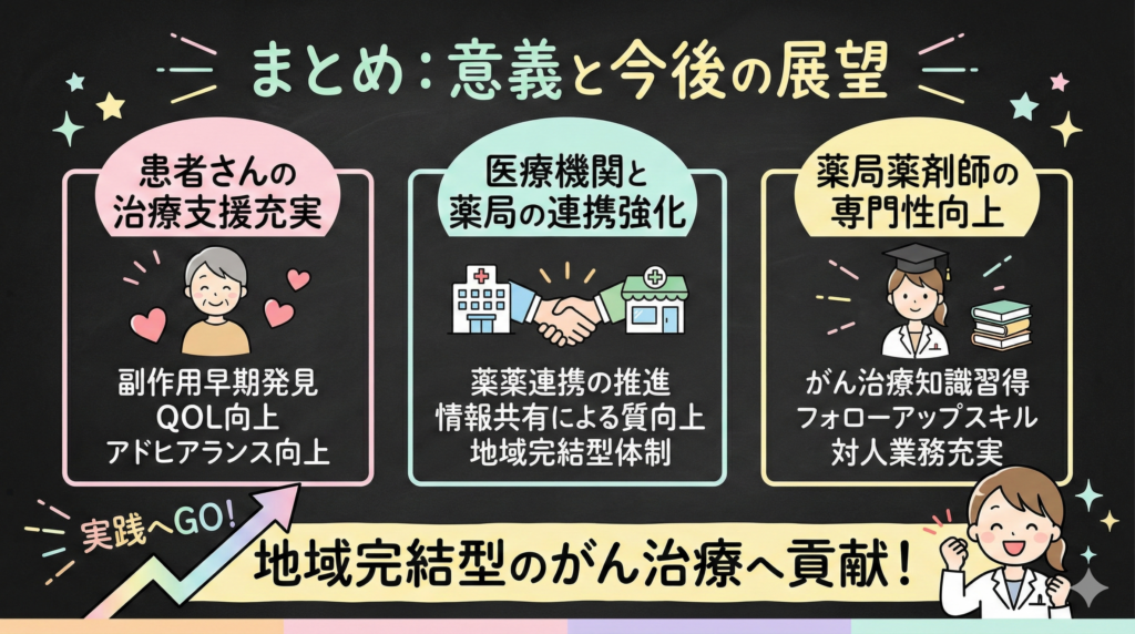 外来がん治療が今後ますます増加する中で、薬局薬剤師によるがん患者さんへの支援の重要性は高まっていくと考えられます。特定薬剤管理指導加算2の算定を通じて、専門性を高め、患者さんの治療を支援する体制を整えていきましょう。