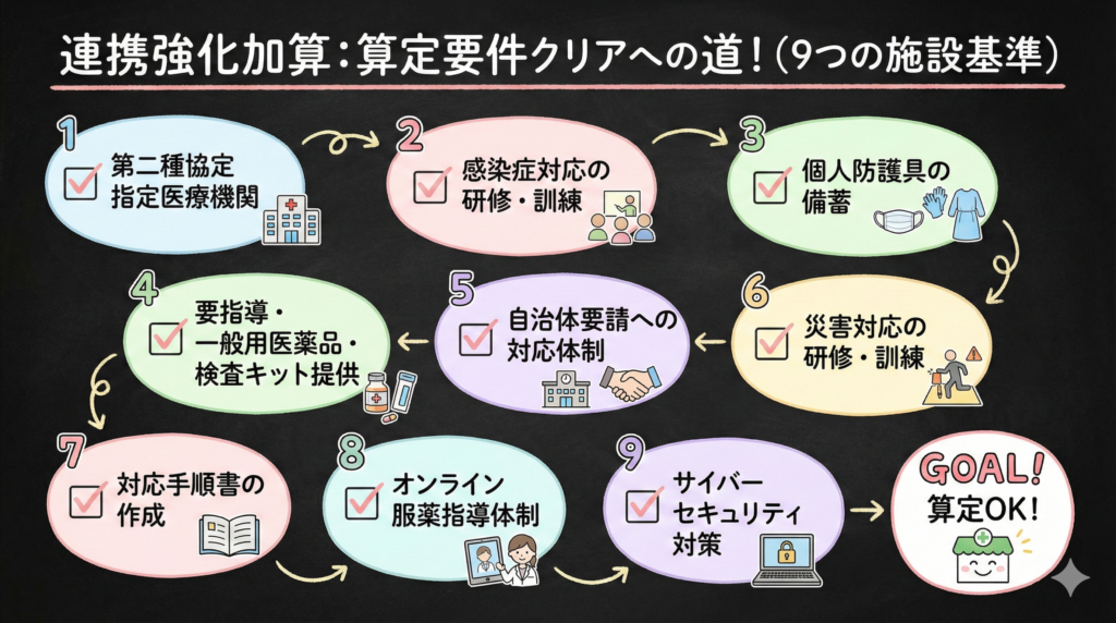 連携強化加算は、2024年度改定で点数が2点から5点に引き上げられ、地域支援体制加算の届出要件が外れたことで、より多くの薬局が算定しやすくなりました。一方で、第二種協定指定医療機関の指定やオンライン服薬指導体制の整備など、新たな要件も追加されています。