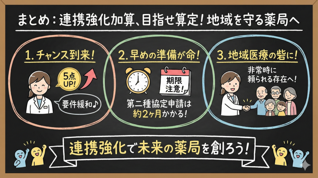 連携強化加算の算定を目指すことは、単に報酬面でのメリットだけでなく、地域における薬局の役割を見直し、強化するきっかけにもなります。非常時に貢献できる体制を整えることは、平時からの地域との信頼関係構築にもつながるでしょう。
