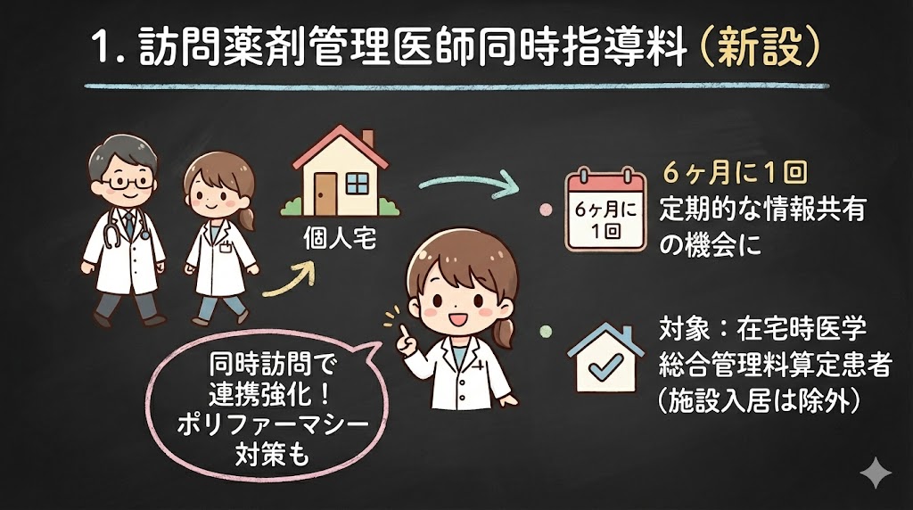 1. 訪問薬剤管理医師同時指導料(新設):医師との同時訪問が点数化