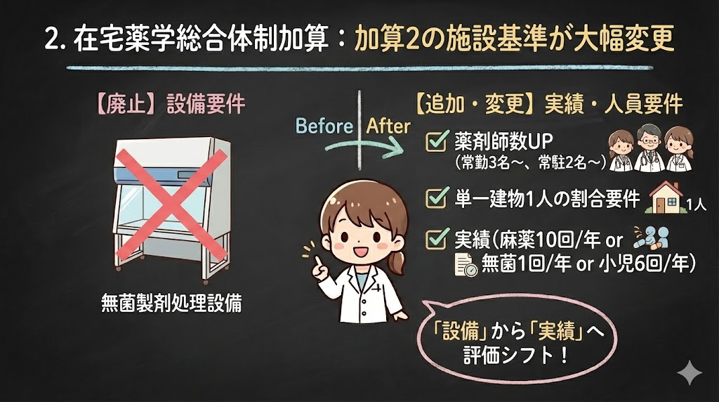 2. 在宅薬学総合体制加算:加算2の施設基準が大幅に変わる
