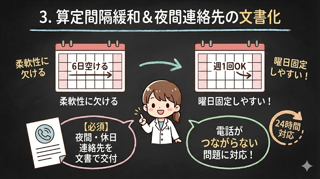 見落としがちですが、今回の改定では「夜間の連絡先を患者に文書で交付する」ことが要件に追加されています。