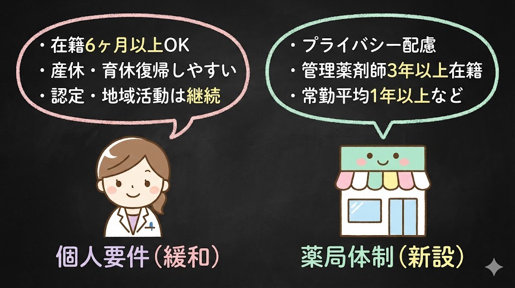 在籍要件が「1年以上」から「6か月以上」に緩和されたことで、産休・育休からの復職者や転職者がかかりつけ薬剤師として届け出やすくなります。キャリアの継続性という観点でも、実質的な影響が大きい変更です。