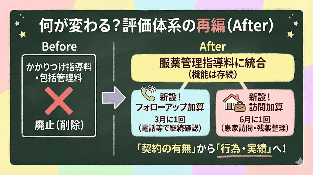 誤解されやすいので先に言うと、「かかりつけ薬剤師」という役割自体は残ります。ただ、それだけで毎回加点される仕組みではなくなる、ということです。