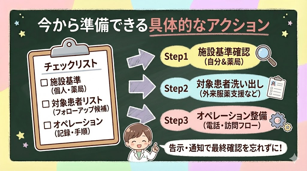 次の一歩として、まずは自分と自薬局の施設基準充足状況を確認することをお勧めします。そのうえで、フォローアップ・訪問の対象になりうる患者さんのリストを把握しておくと、施行後にスムーズに動けます。