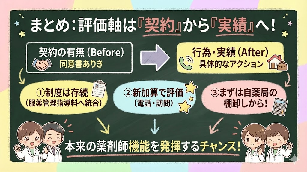 ただ、ここで一度立ち止まって整理したいのが、「廃止」が何を意味するかです。結論から言うと、かかりつけ薬剤師という制度そのものが消えるわけではありません。評価の仕組みが「契約の有無」から「具体的な行為・実績」へと再編されます。
