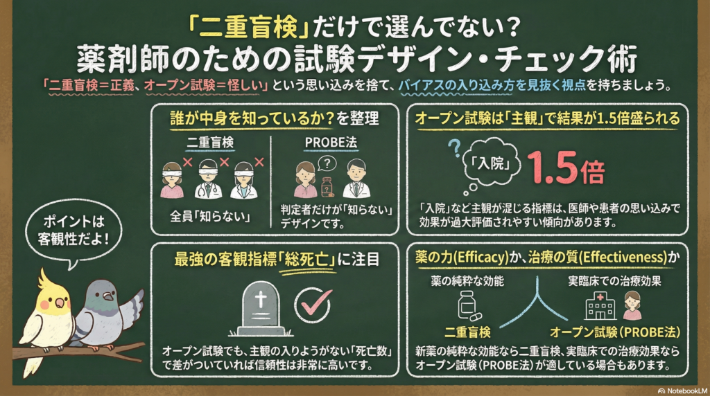 - 二重盲検か否かだけで判断せず、「このデザインは試験の目的に合っているか」を考える