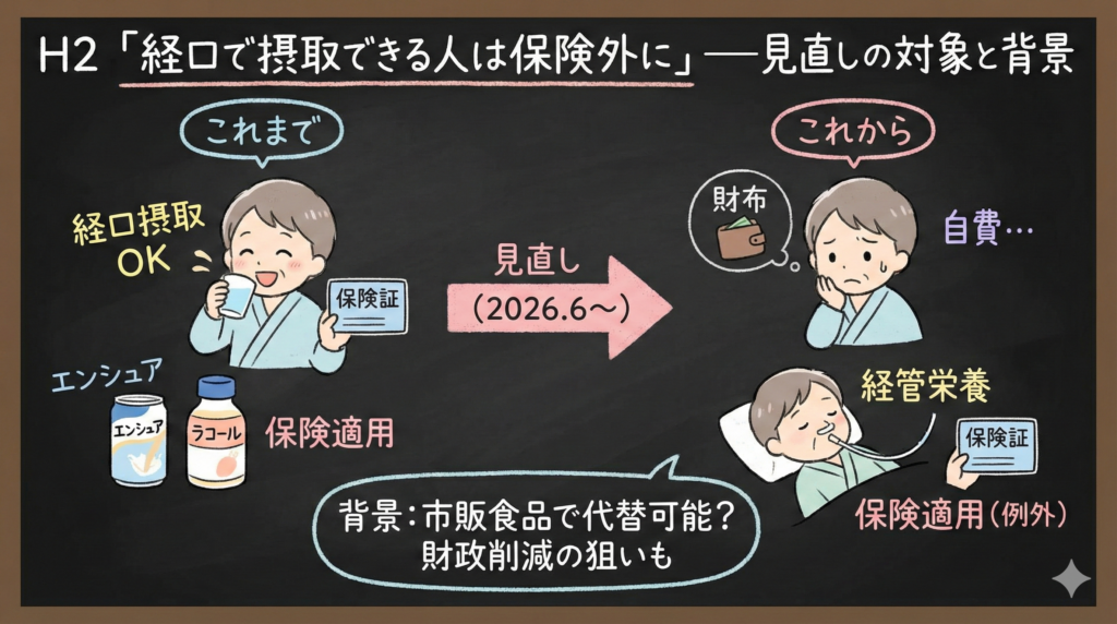 2026年6月から、エンシュア等の保険給付は「経管栄養の場合等を除き保険給付除外」の方向性です。ただし、”等”の範囲(手術後、フレイル、医師の判断など)は最終通知で確定します。