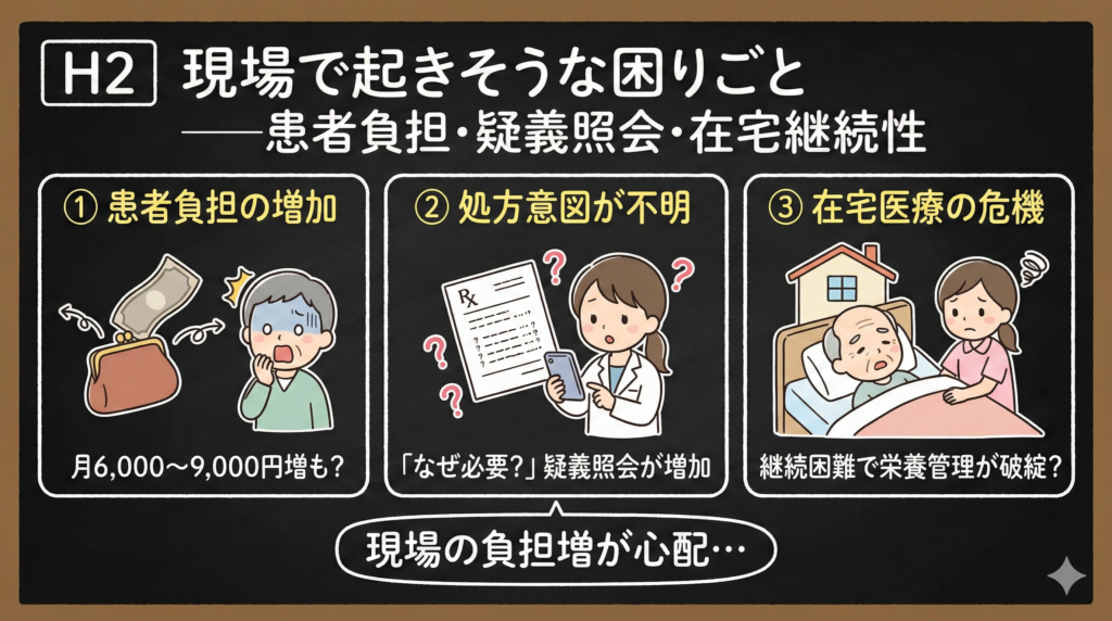 - 現場で起きそうな困りごと(患者負担・疑義照会・在宅継続性)