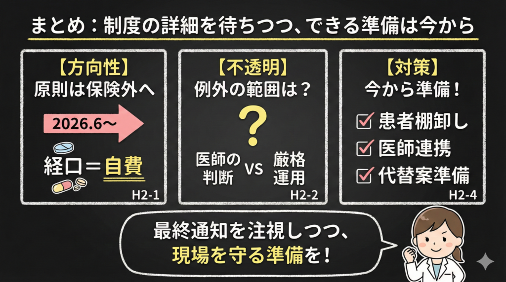 「手術後」「経管栄養」「他で代替不能」など、医学的必要性を示す情報が処方箋にないと、薬局側は判断できません。中医協でも「運用ルールの明確化」が議論されており、処方理由の記載や疑義照会の必要性が高まる可能性があります。