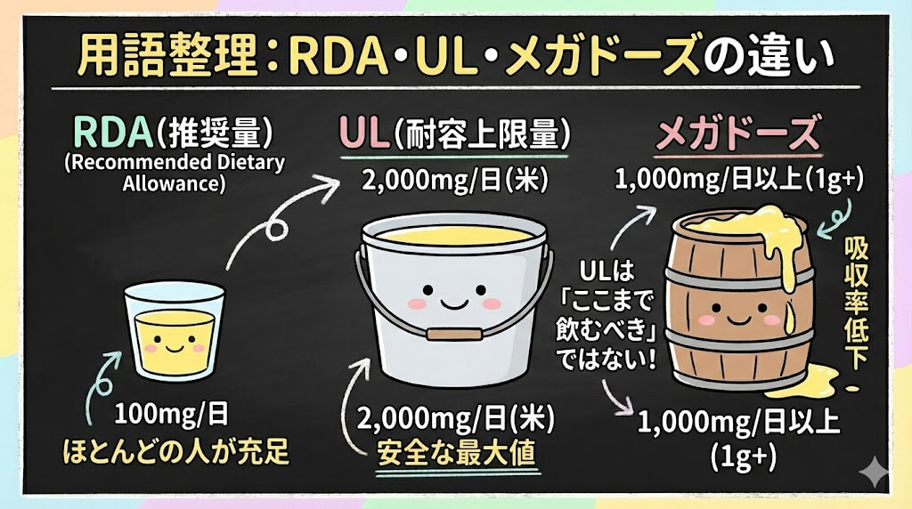 用語整理|「メガドーズ」「RDA」「UL」を混同しないために