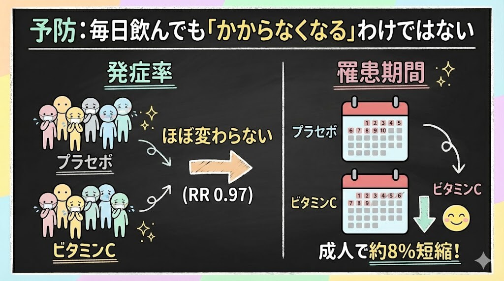 ここ、迷いやすいところです。なぜなら「ビタミンC=風邪予防」という話は、完全な間違いではないけれど、かなり”盛られた”状態で広まっているからです。予防(普段から飲む)と治療(発症してから飲む)で結論がまるで違うのに、そこがごちゃ混ぜになっている。