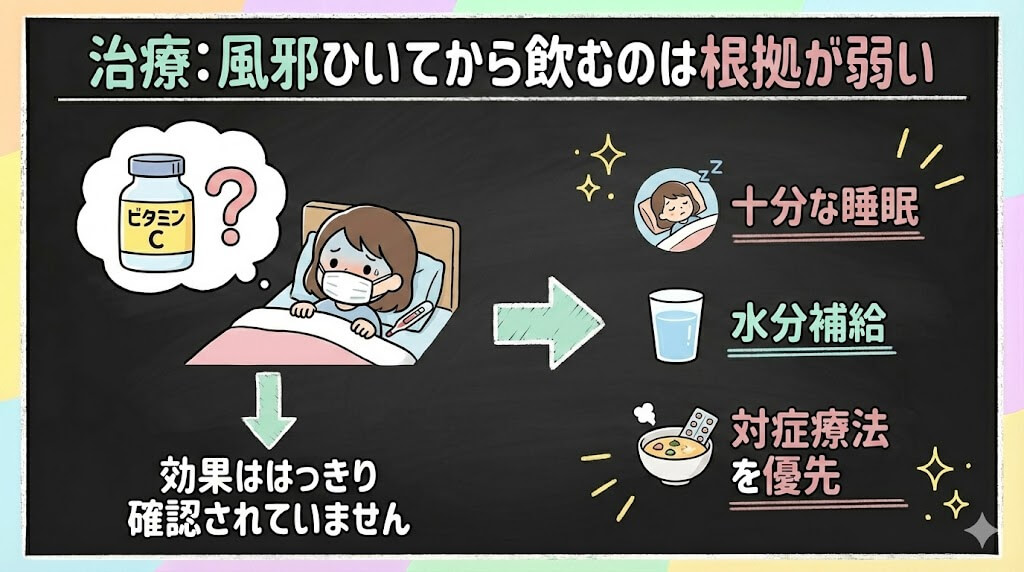 コクランレビューの治療試験(発症後にビタミンCを開始、7比較・3,249エピソード)では、罹患期間にも重症度にもプラセボとの有意差は認められていません。