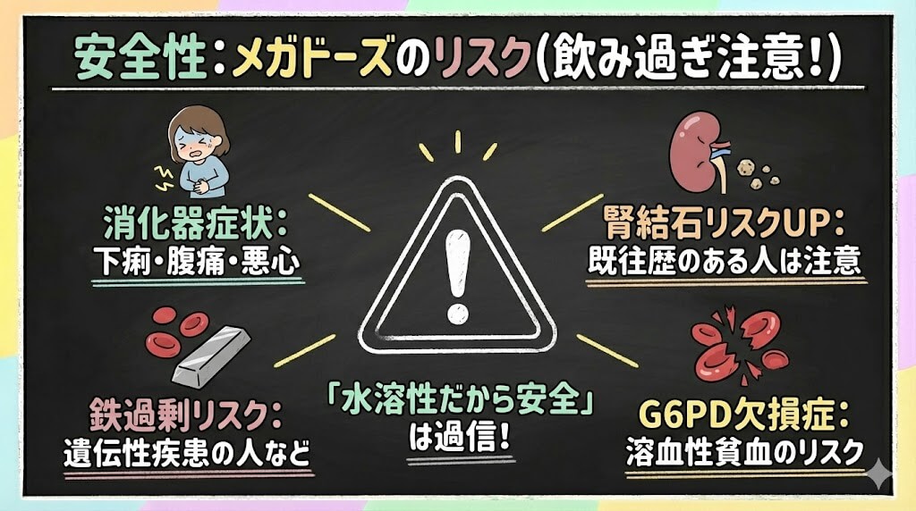 そうですね。特に腎疾患や鉄代謝異常のある方、がん治療中の方には確認が必要です。”水溶性だから安全”という思い込みは、やんわりでいいので修正しておきたいですね。