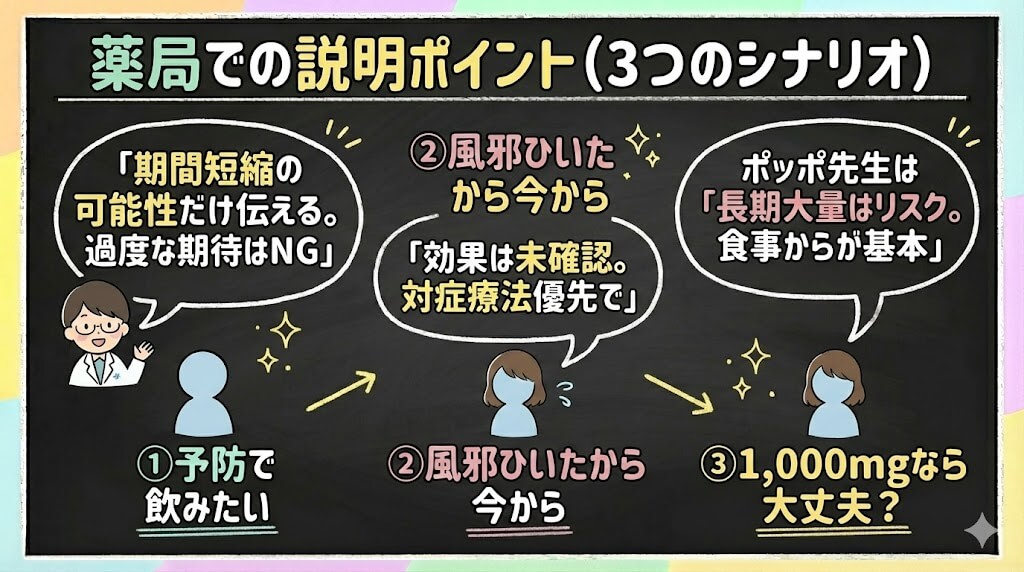OTC売場でも、投薬中の質問でも、このパターンは本当に多いです。私も「ビタミンCって、たくさん飲めば風邪に効くんですよね?」と聞かれるたびに、どこまで踏み込んで答えるか迷ってきました。