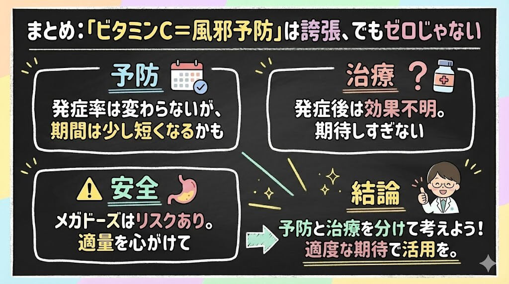 まとめ|「ビタミンC=風邪予防」は誇張、でもゼロではない
