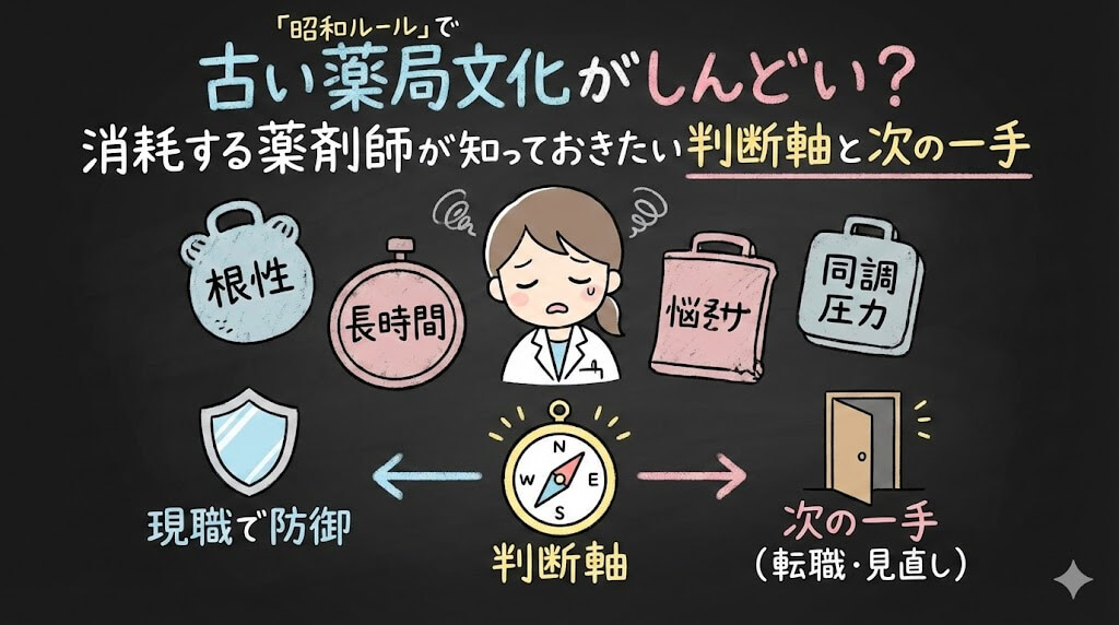 誤解されやすいので先に言うと、これは「昭和世代が悪い」という話ではありません。個人の問題ではなく、組織として長年かけて固まった「当たり前」の問題です。逆に言うと、若い管理薬剤師でも古い文化を踏襲していることはあります。年代ではなく、構造を見る目が必要です。