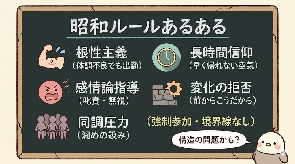 「古い文化」といっても漠然としていますよね。ここでは、薬剤師の友人たちから聞く「昭和ルール」の典型パターンを整理してみます。いくつ当てはまるかチェックしてみてください。