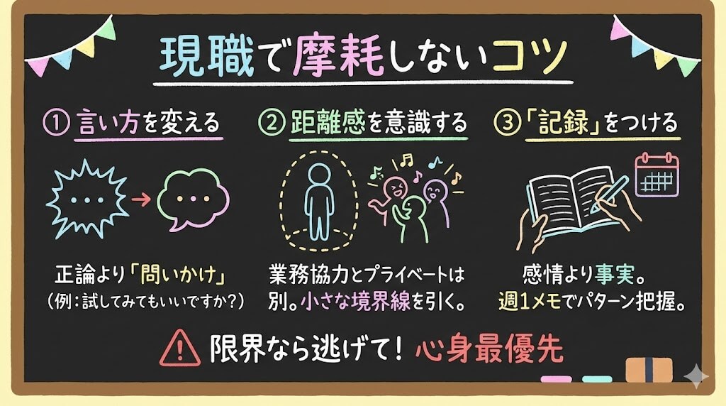 • 現職で消耗を減らす工夫(言い方・距離感・記録)をまず試す