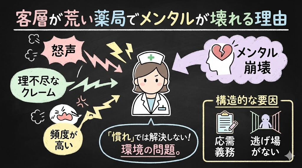 「客層が荒い」という言葉、薬局の求人票には絶対に書かれません。でも、働いている私たちにはわかります。窓口に立つたびに胃がキュッとなる感覚。怒鳴り声が飛んできた日の夜、布団の中でリプレイが止まらない感覚。あれは「慣れ」では解決しないタイプのしんどさです。
