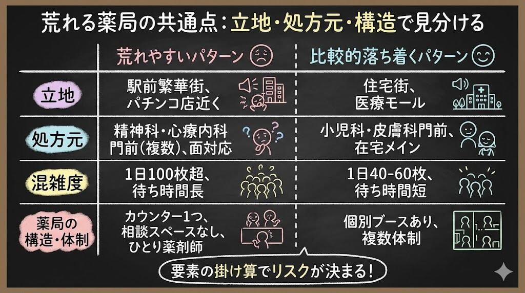 客層が荒れやすい薬局には、いくつか共通するパターンがあります。友人たちの話を総合すると、だいたい以下の要素が複数重なっているケースです。