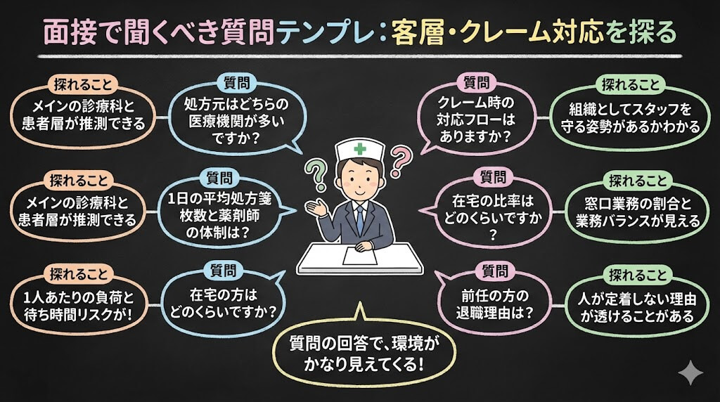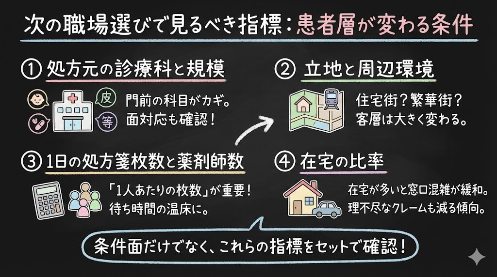 - 次の職場を選ぶときは「処方元の科目」「処方箋枚数と薬剤師数」「クレーム対応フローの有無」をセットで確認する