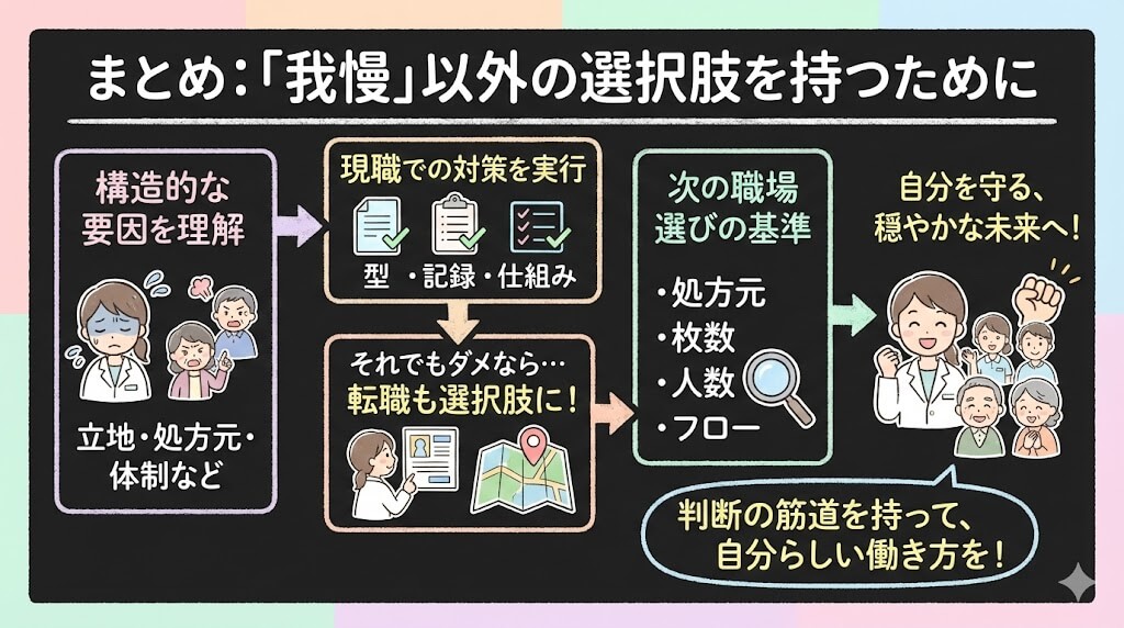 客層が荒い薬局で消耗するのは、あなたが弱いからではありません。立地・処方元・混雑度・体制という構造的な要因が重なったとき、どんなに対応スキルが高くてもメンタルは削れます。