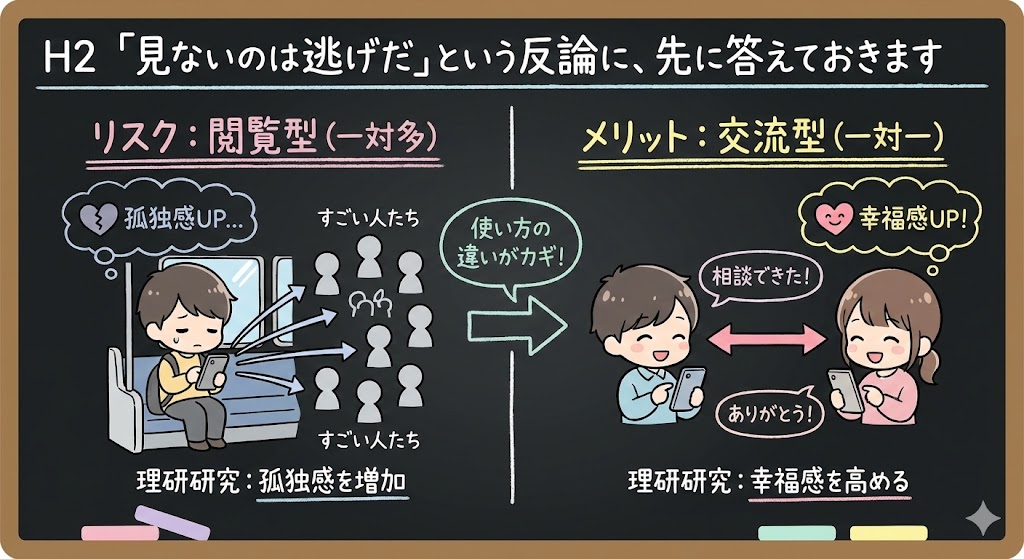 誤解されやすいので先に言うと、SNSのすべてが悪いわけではありません。ここは研究データで切り分けられます。