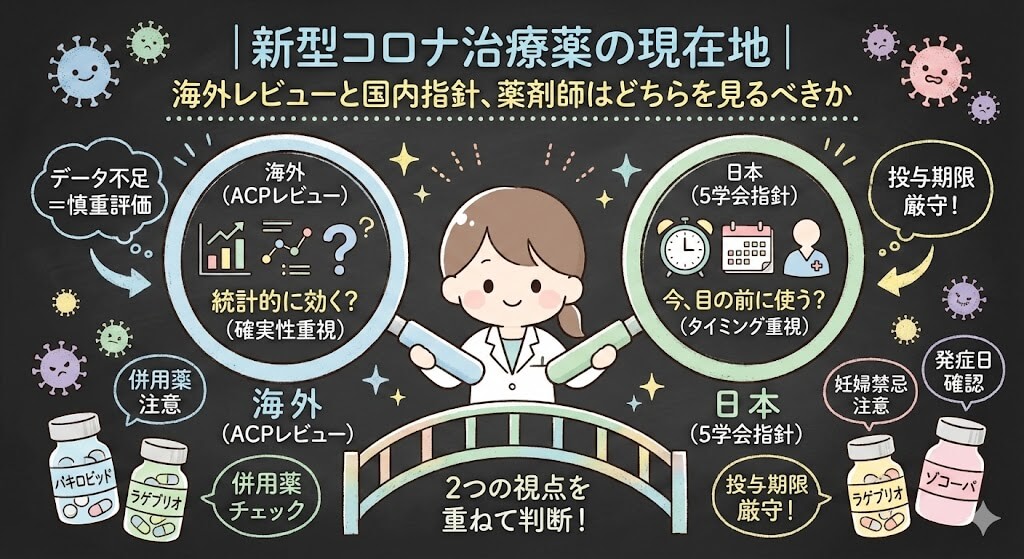 この記事では、2025年公表の5学会指針と、ACP(米国内科学会)のLiving Rapid Review Version 3の内容を軸に、薬局薬剤師として押さえておきたい判断の筋道を整理します。「結局どれを信じればいいの?」というモヤモヤに、私なりの交通整理をお伝えできればと思います。