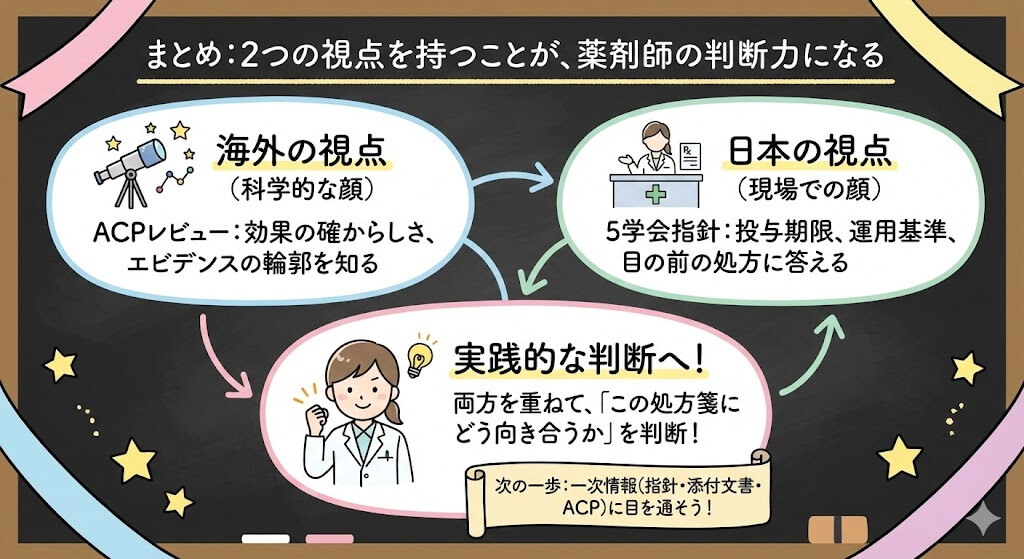 私ならまず、この前提を頭に入れたうえで両方を読みます。どちらか一方に偏ると、判断がゆがみます。ACPだけ読むと「微妙な薬」に見える。日本指針だけ読むと「とにかく早く出せ」に見える。逆に言うと、両方を重ねると実務的な判断材料がかなり揃います。
