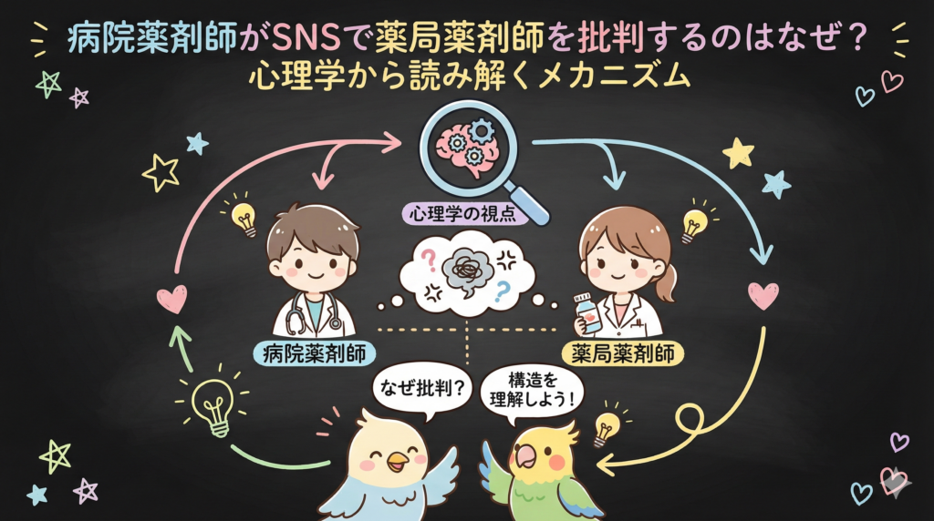 この記事では、病院薬剤師がSNSで薬局薬剤師を批判する現象を、心理学の視点から解説します。「誰かが悪い」という話ではありません。むしろ、一定の環境条件が揃うと人間誰しも陥りうる心理メカニズムの話です。この構造を理解しておくと、自分自身がモヤモヤしたときにも「あ、今これが起きてるな」と一歩引いて見られるようになります。